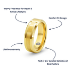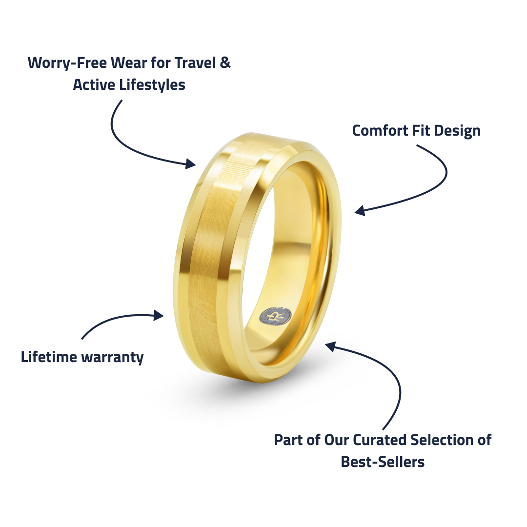 Most travel rings feel like a downgrade. The Ace doesn’t. With its brushed gold finish and subtle polish, it looks sharp with everything from a t-shirt to a blazer, and it’s tough enough for travel, long days, and weekends away. It takes the hits so your wedding-day band doesn’t have to—backed by our lifetime warranty so you can wear it hard without worrying.